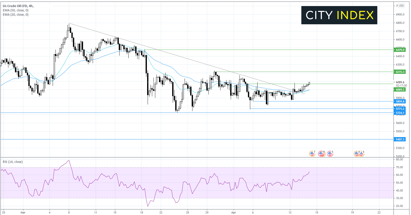 西得州原油价格在周一的时候站上其3月初以来的下降趋势线。