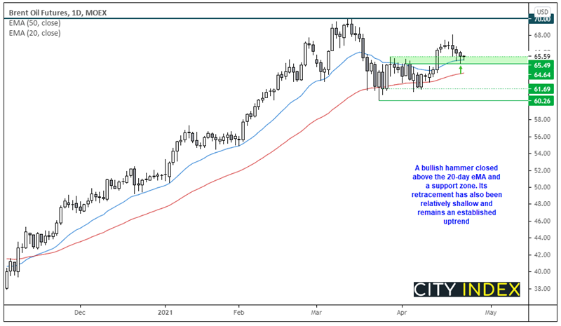 我们猜想油价正在构筑底部。西得州原油在(上周三低点)60.38上方企稳,加重了该支撑在多头阵营心中的分量,也使其成为需要关注的中枢价位。布伦特原油构筑看涨锤子K线并收上20天指数移动均线支撑65.50,此前盘中一度下破该支撑。从长期上涨趋势判断我们继续看涨,并且在近期的回调中,布伦特原油的幅度小于西得州原油,所以我们更好于前者。