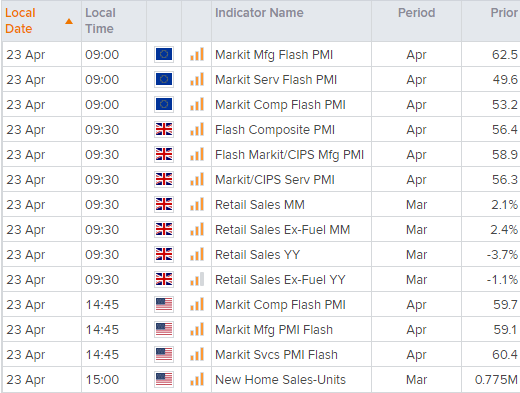 - 美元指数(DXY)仍受制于91.30/40阻力区下方,不过在昨天看涨吞没K线背景下,价格接近上破该阻力。因此交易员应继续关注美元指数和欧元/美元,后者正在试探1.2000关键支撑。股市下行将带动欧元下穿支撑,而风险情绪反弹则会让货币对守住该支撑水平。此外,不要忘了今天的主要经济数据发布包括欧洲、英国和美国的PMI初值。